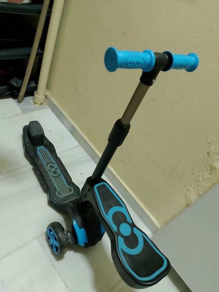 Koyu mavi renkte, sağlam tutma kolları ve denge için üç tekerleği olan çocuk scooterı. Çocuklar için konforlu sürüş sağlar. Sadece 2 kere kullanılmıştır hem ayakta hem oturarak kullanılabilir oturak çıkıyor