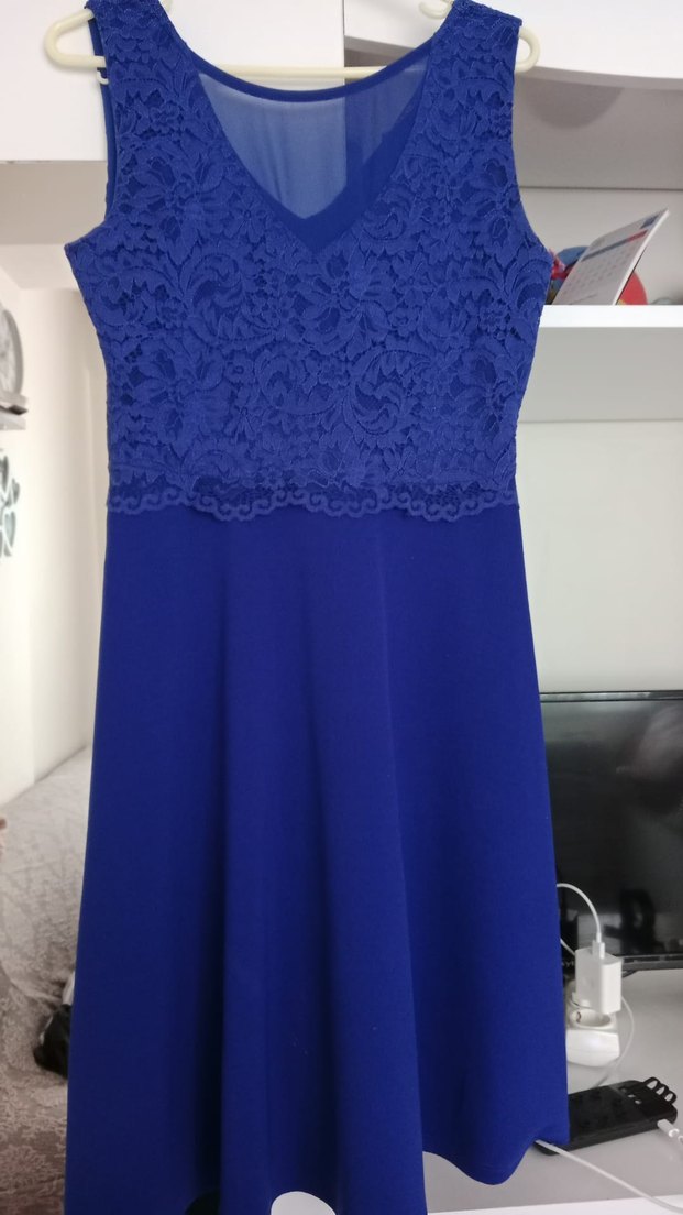 Koyu mavi renkte, dantel detaylı üst kısmı ve V yaka kesimi olan, kolsuz ve vücuda oturan midi boy abiye elbise. Düğünler için modern klasik ve minimalist tarzda uygun.Açıklama: Üst kısmı şık dantel işlemeli, altı dökümlü ve formunu koruyan kumaştan üretilmiş saks mavisi elbise. Hem özel davetler hem de şık akşam yemekleri için idealdir. Sadece bir kez giyilmiştir, hiçbir kusuru yoktur.