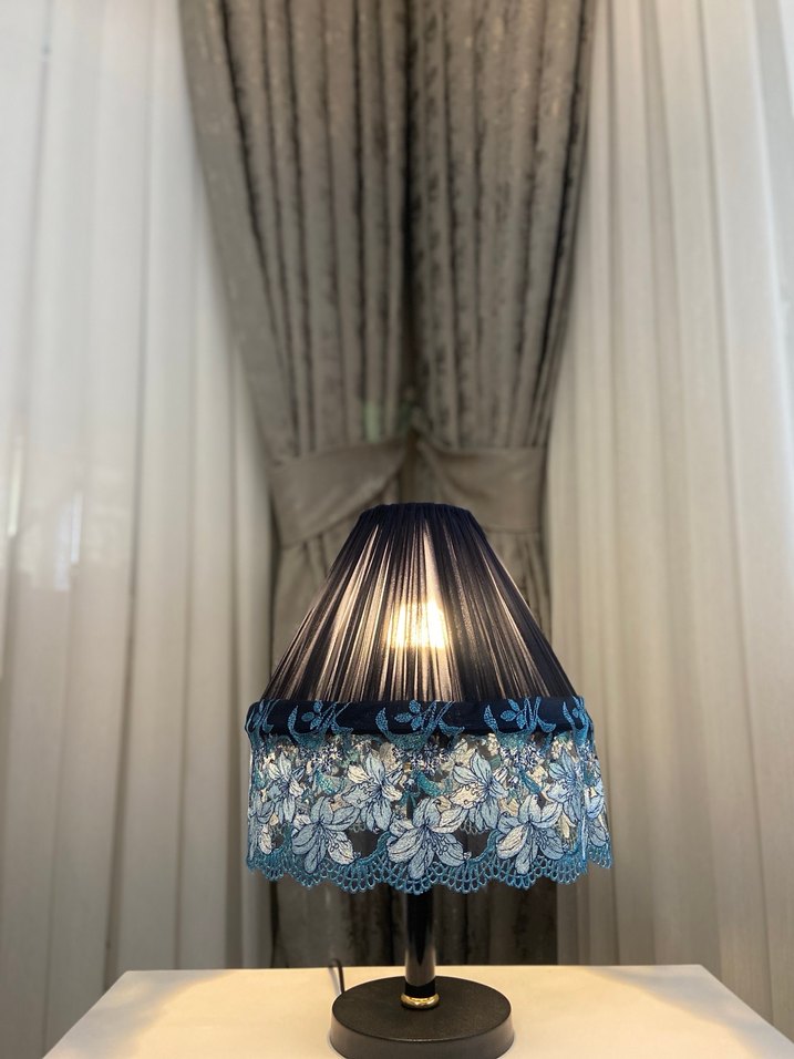 Koyu mavi renkte, çiçek desenli dantel süslemeli abajur, yumuşak ve şık bir aydınlatma sağlar.