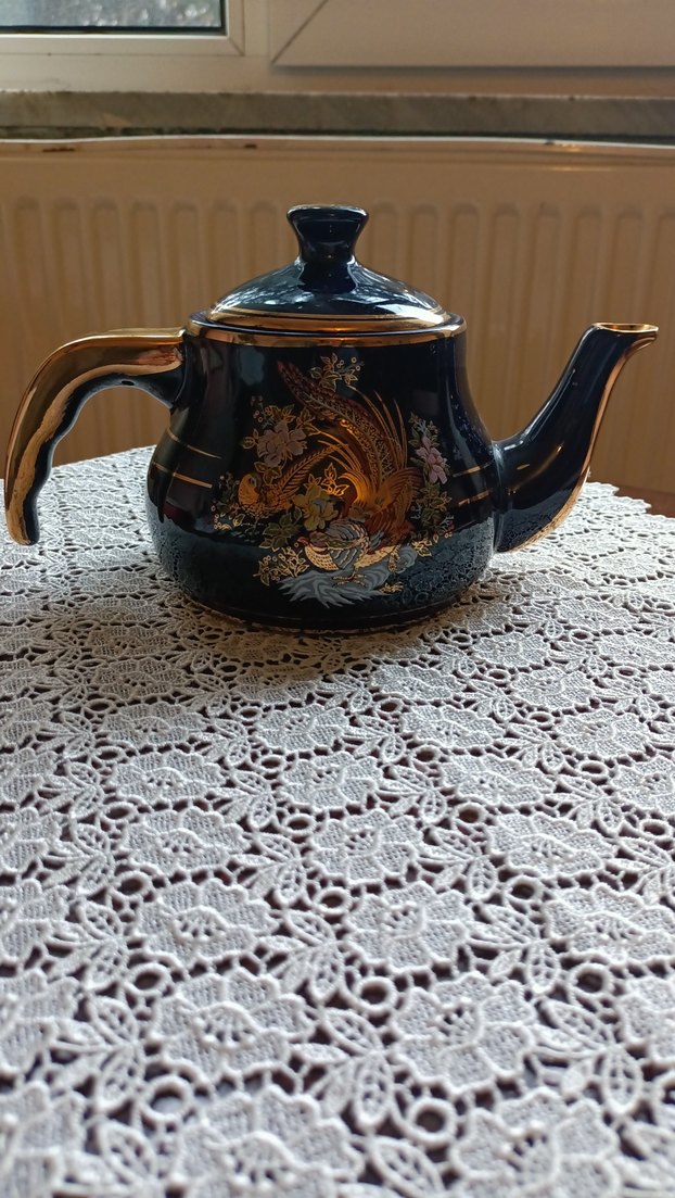 Altın renkli sapı ve çiçek desenleri olan koyu mavi, parlak seramik çaydanlık( Ansan Porselen marka). Bitki çay servisinde kullanılır.