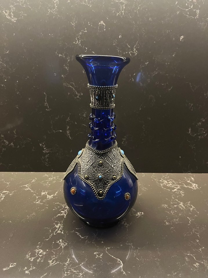 Koyu mavi cam gövdeye sahip, ince işlemeli gümüş süslemeler ve küçük renkli detaylar içeren dekoratif vazo.