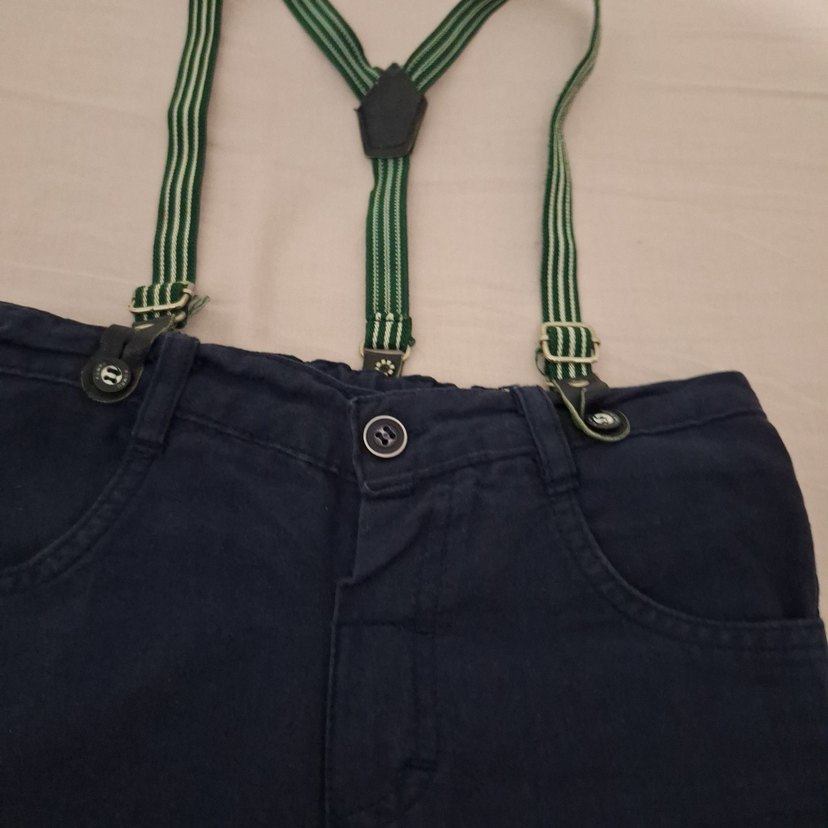 Koyu mavi denim kısa çocuk pantolonu, yeşil çizgili ayarlanabilir tokalı askılarla tamamlanmıştır. Trendy casual stil için uygundur. 104 - 4 yaş Ayarlanabilir kısa pantolondur.