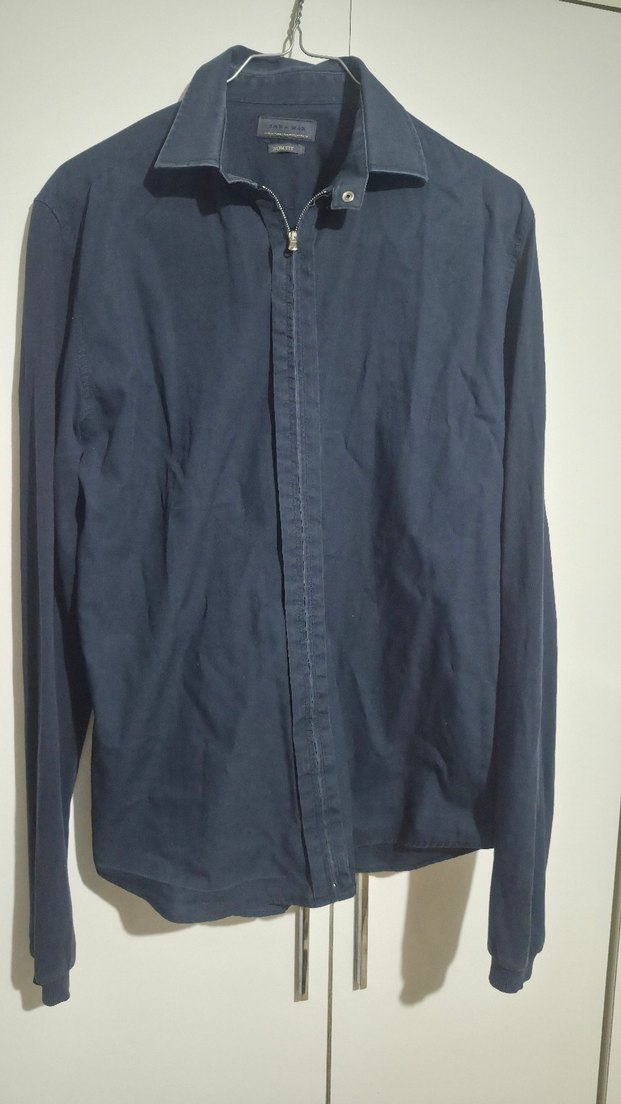 Koyu mavi denim kumaştan, uzun kollu, fermuarlı ve yaka detaylı erkek gömleği. Rahat kesim, ofis ve günlük kullanıma uygun.