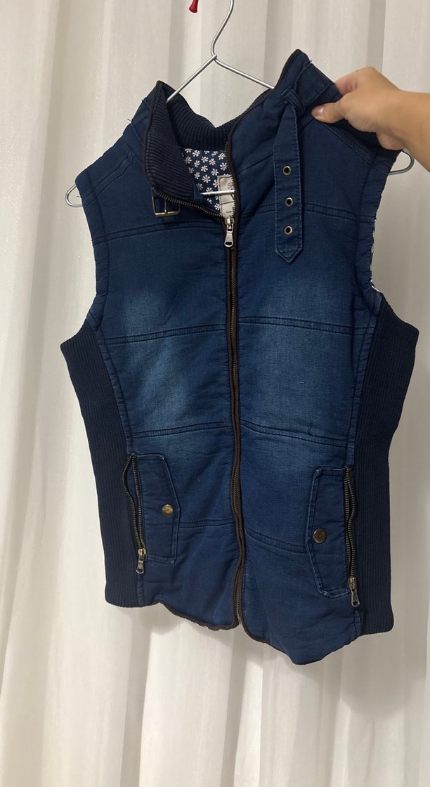 Koyu mavi denim kumaştan, fermuarlı ve yüksek yakalı, kolsuz kadın yelek. Dar kesim ve fermuarlı ceplere sahip, gündelik sokak stiline uygun.
