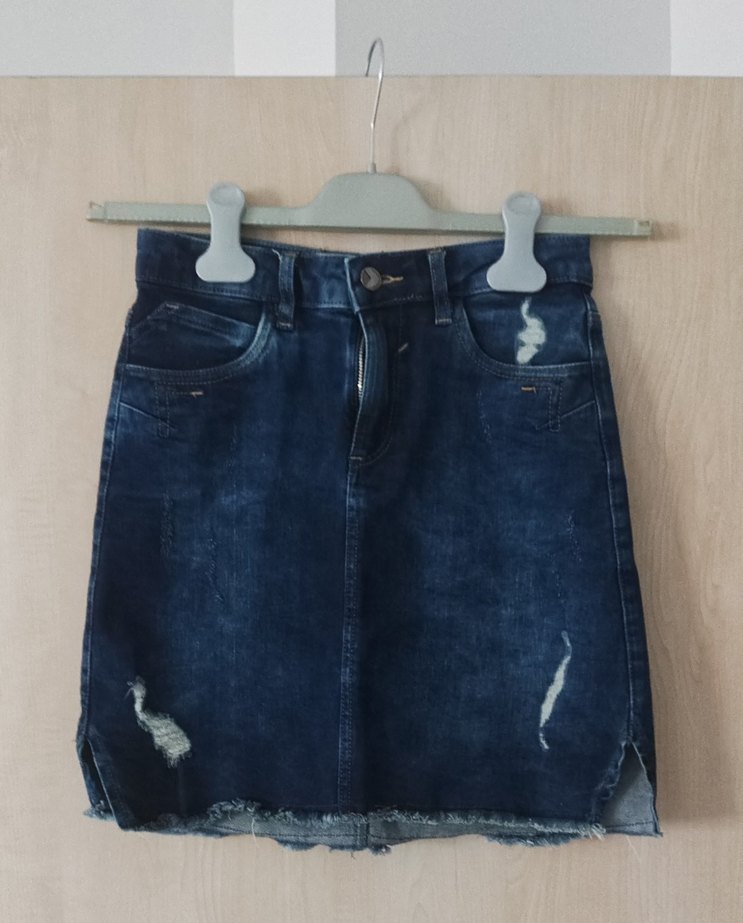 Koyu mavi renkte, kemerli ve bol kesimli denim mini etek, yıpranmış detaylarla sokak modasına uygun.