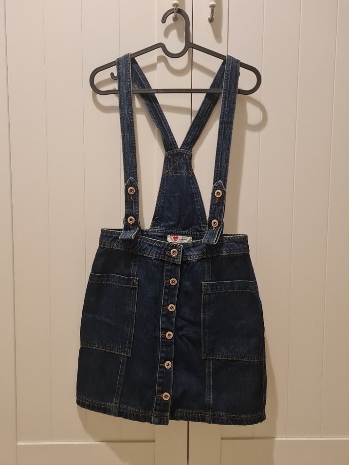 Koyu mavi denim kumaştan, tokalı askılı ve ön düğmeli, straplez tasarımlı, günlük rahat sokak stili için uygun kısa salopet.