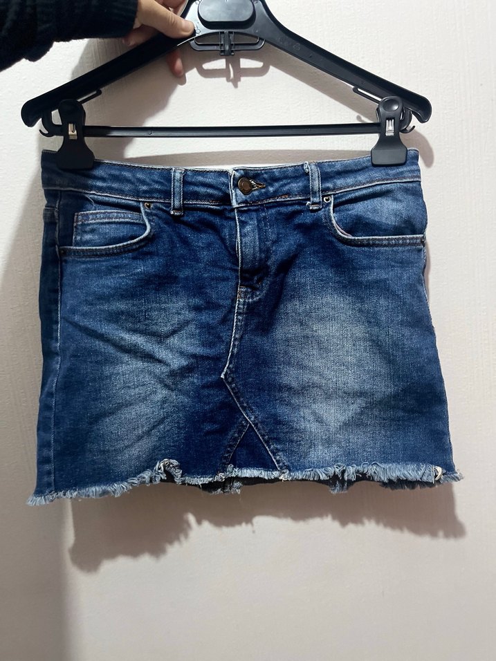 Koyu mavi renkte, tokalı ve kenarları yıpranmış detaylı, dar kesim denim mini etek. Günlük sokak stili için uygundur.