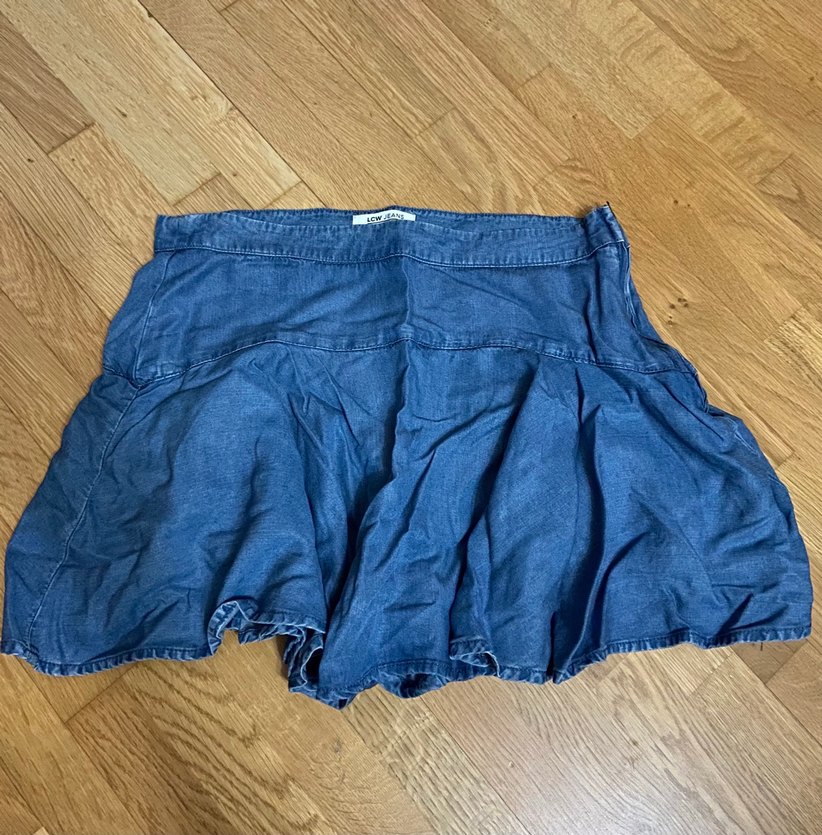 Koyu mavi renkte, denim etek. Basit ve şık bir görünüm sunar. Arkası da etek görünümlü