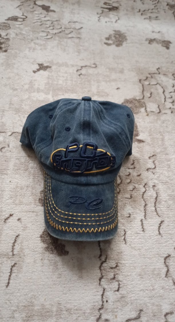 Koyu mavi denim kumaştan, nakışlı yazılı şapka, trend spor tarz için uygundur.