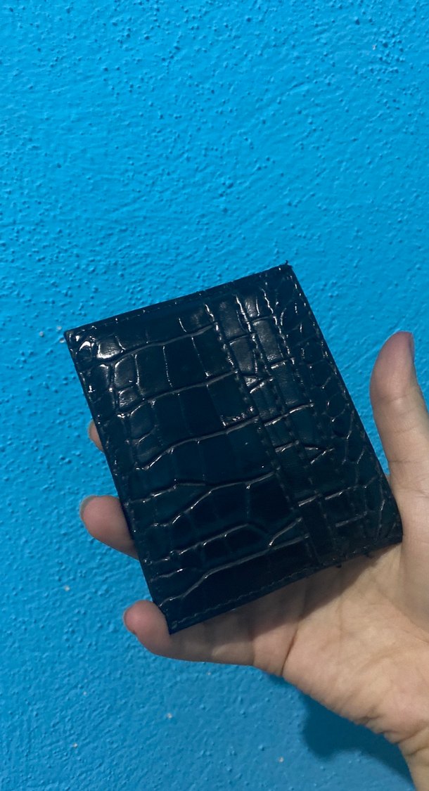 Koyu mavi deri kadın cüzdanı, tokalı ve yılan derisi desenli olup Parisli karşı kültür tarzını yansıtır.
