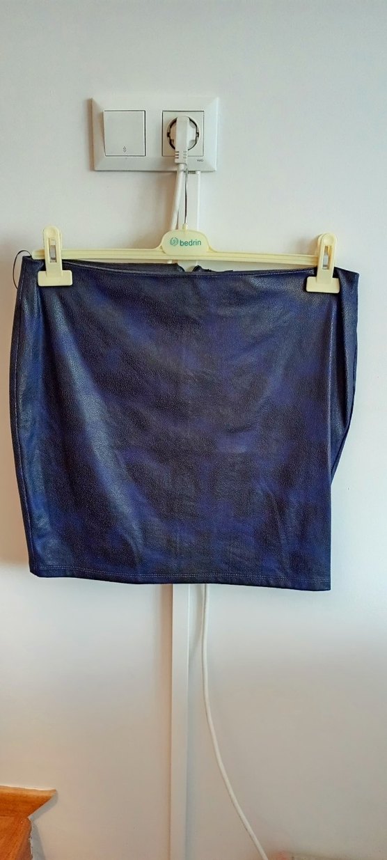 Koyu mavi deri mini etek, kemerli ve hafif batik desenli. Kısa boy ve vücuda oturan kesime sahip. Sıfır ürün