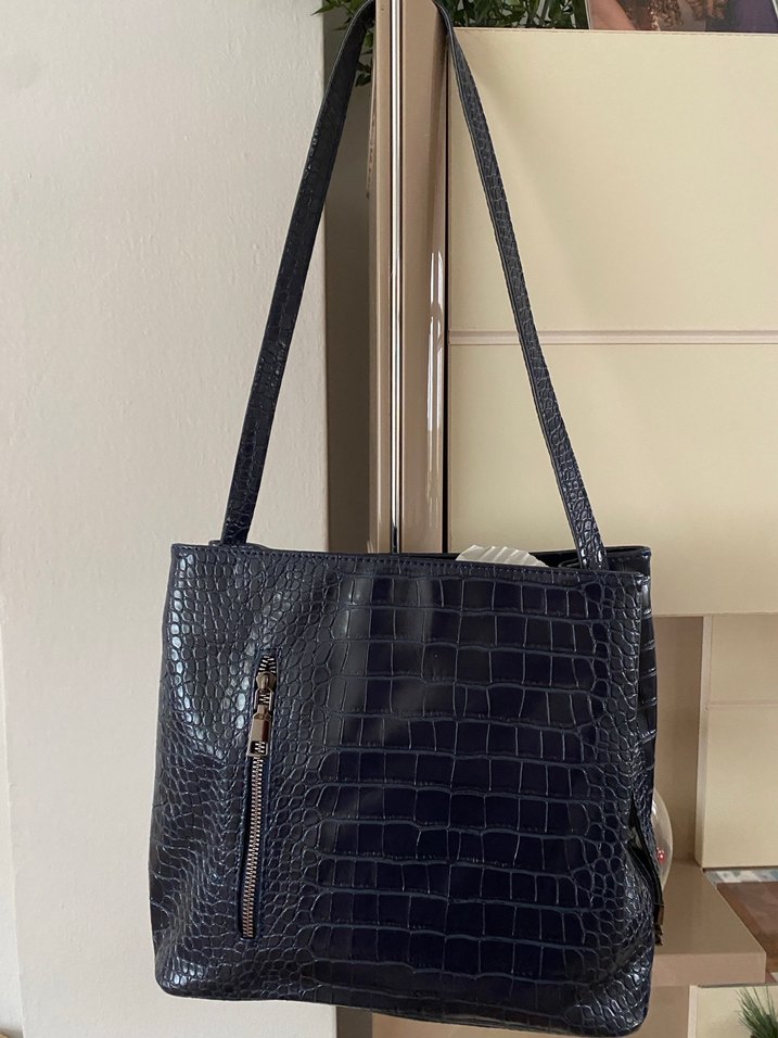Koyu mavi deri yılan desenli, fermuarlı çanta. Günlük kullanım için klasik ve şık bir sokak stili parçası.