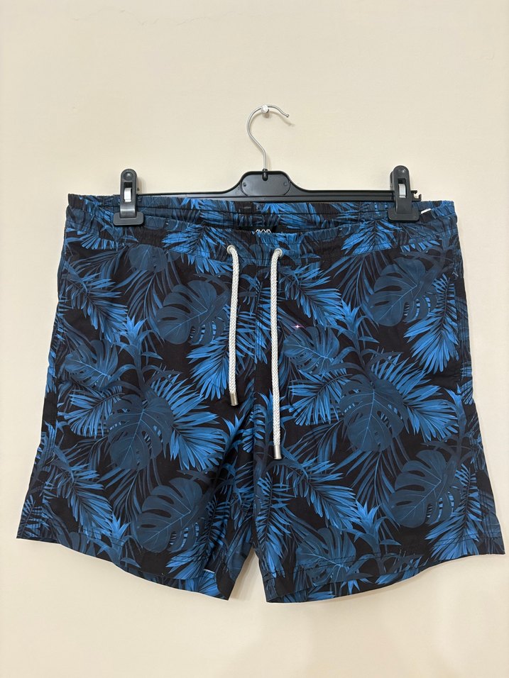 Koyu mavi yaprak desenli, bağcıklı erkek kısa deniz şort. Rahat kesimiyle plajda şık ve rahat kullanım sağlar.