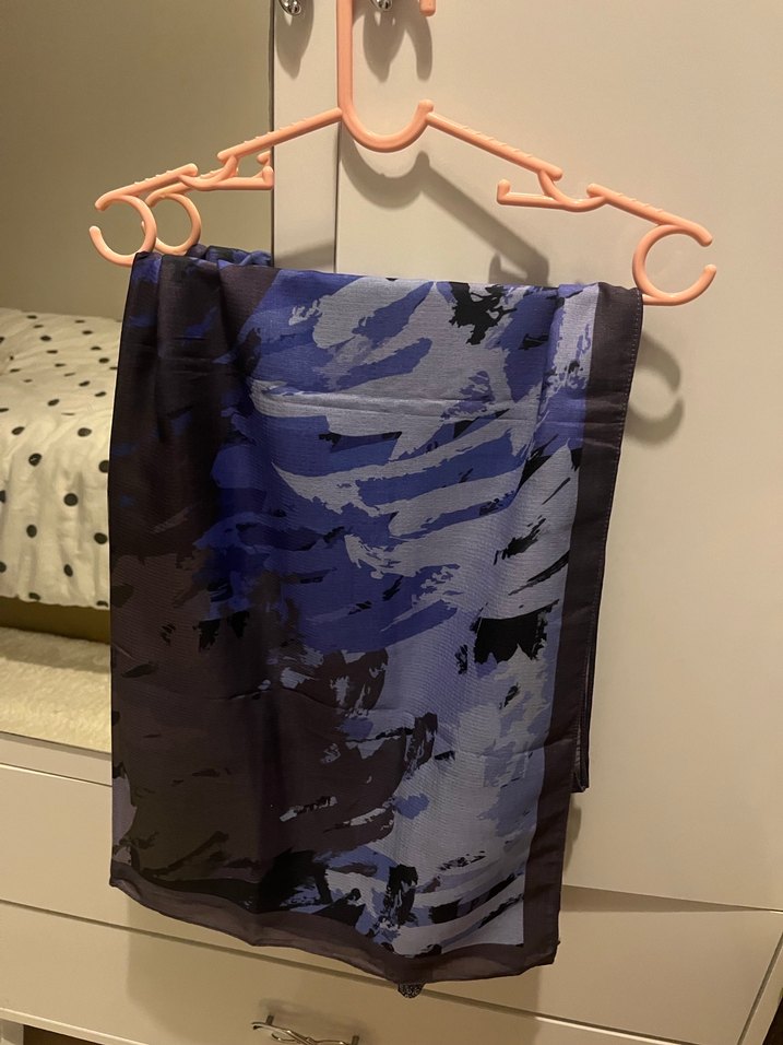 Soyut desenlere sahip koyu mavi eşarp, hafif kumaştan üretilmiştir ve kıyafetlere zarif bir dokunuş katar. Modakaşmir hiç kullanılmadı