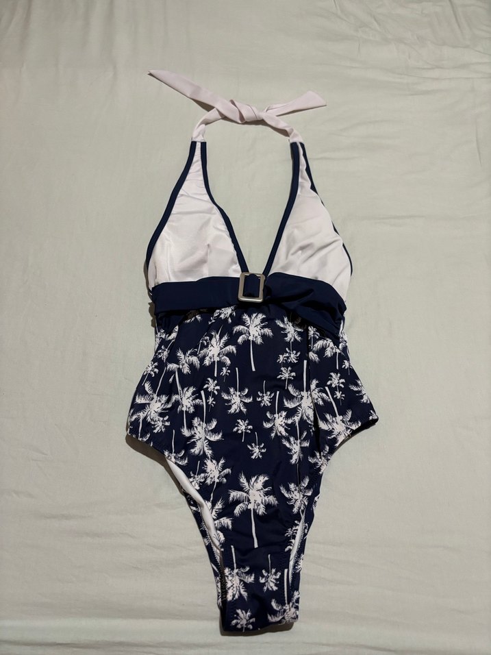 Koyu mavi tropikal desenli, askılı ve tokalı, vücuda oturan kadın mayo. Midi boyda, cesur sokak modası tarzında, plaj için uygun. Hiç giyilmedi 36-38 beden