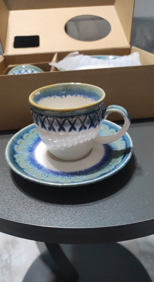 Koyu mavi desenli, dokulu tasarıma sahip porselen fincan ve tabak seti, klasik ve şık bir görünüm sunar. ☕