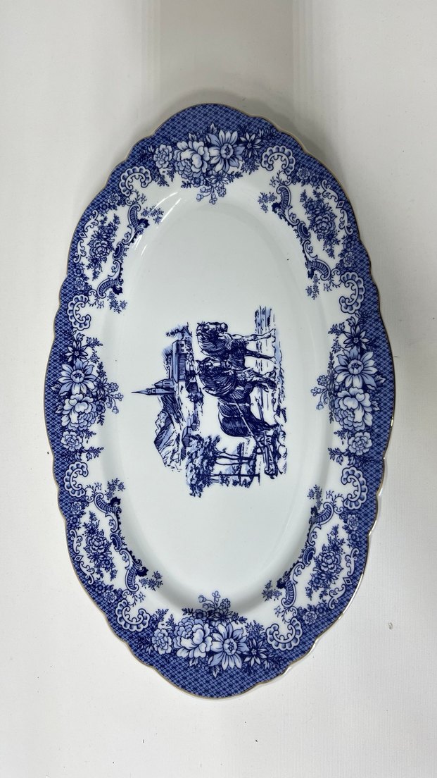 Koyu mavi çiçek ve manzara desenleriyle süslenmiş oval porselen servis tabağı. Detaylı orta resim bulunur. Şık sunumlar için uygundur. ️