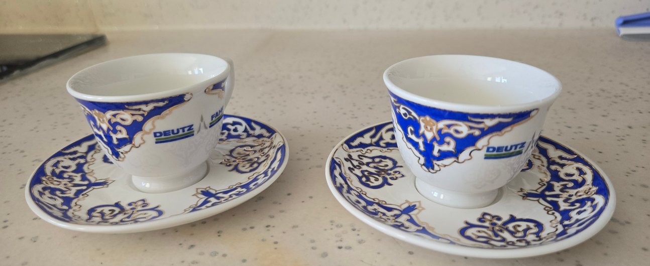 Koyu mavi detaylı desenlere sahip seramik fincan ve tabağı, sıcak içecekler için uygundur. ☕ üzerinde yazı var fotoğraf'ta gördü gibi. 4 parça 2 kişilik takım.