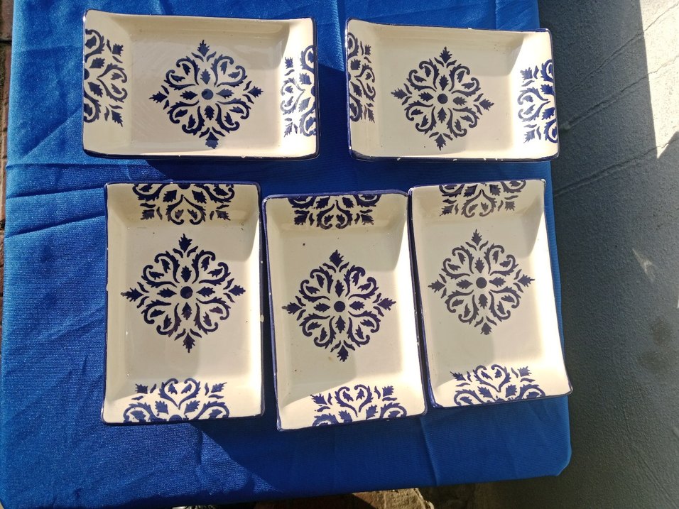 Koyu mavi desenlere sahip dikdörtgen seramik yemek tabakları. Çeşitli yemekler için uygundur. ️