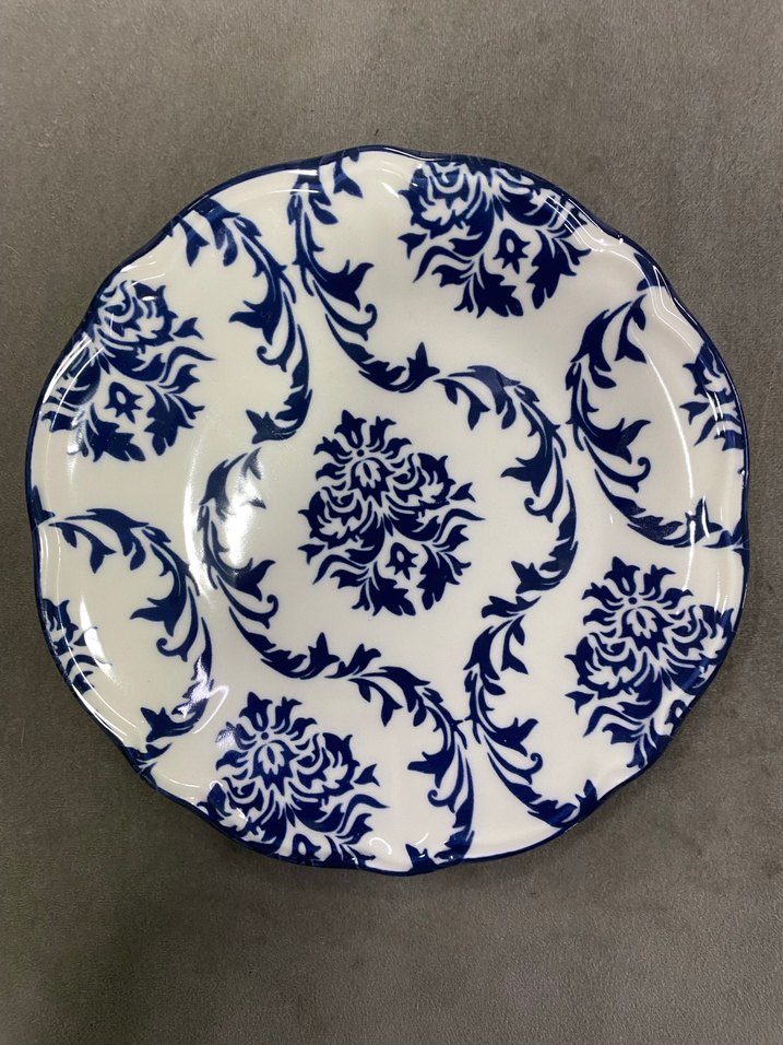 Bu seramik tabak, beyaz zemin üzerinde koyu mavi karmaşık çiçek desenine sahiptir, şıklık ve işlevselliği bir arada sunar. ️