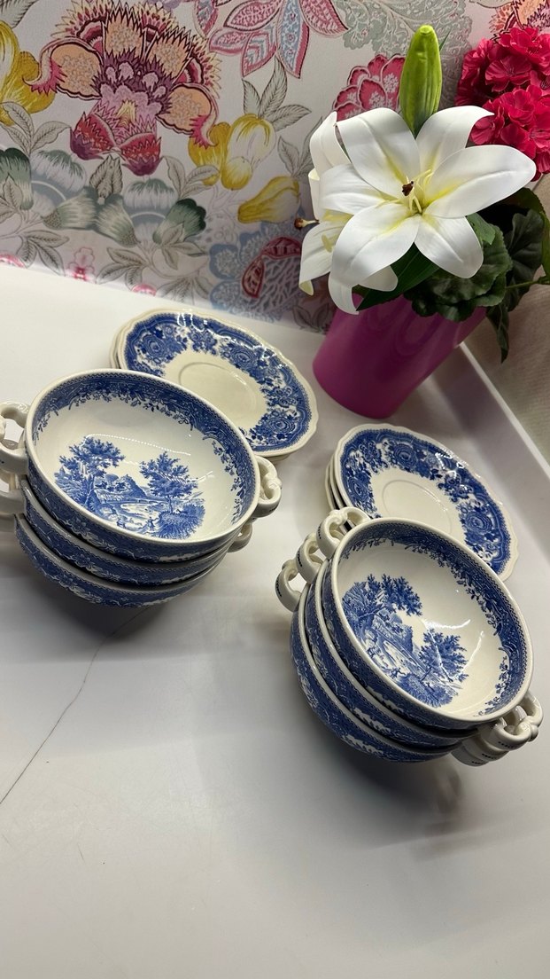 Koyu mavi desenli, kulplu seramik yemek kapları seti. Ayrı desenli tabaklarla birlikte sunulur. Yemek servisi ve saklama için uygundur. ️
