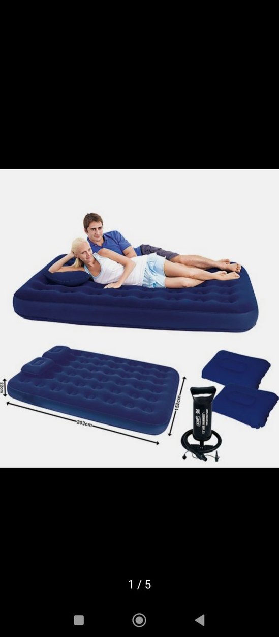 Koyu mavi renkte, desenli şişme yatak koruyucu, yumuşak ve rahat yapıda, pompa ve yastıklarla birlikte gelir. Uzunluğu 203 cm'dir. ️