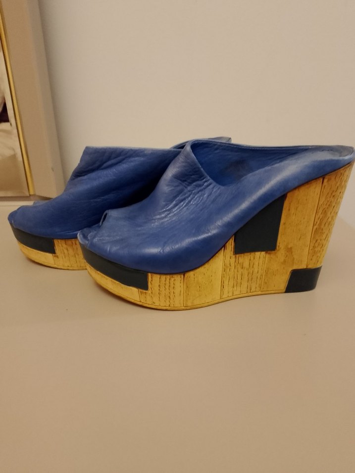 Kadın dolgu topuklu ayakkabılar koyu mavi üst yüzeye ve mavi detaylara sahip, ahşap görünümlü kauçuk topuk ile günlük kullanıma uygun.