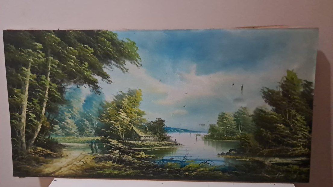 Bu tablo, koyu mavi gökyüzü altında yemyeşil ağaçlar ve küçük bir kulübe ile sakin bir göl kenarı manzarasını yansıtıyor.
