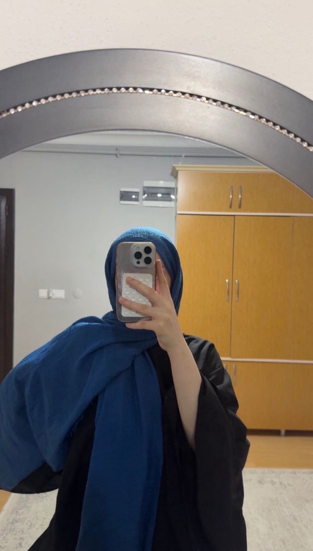 Koyu mavi renkte, drapeli tasarıma sahip kadın şalı, sade ve modest görünüm için sentetik kumaştan üretilmiştir.