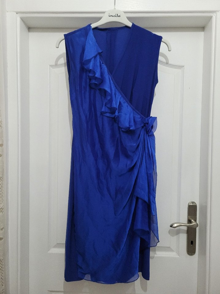 Koyu mavi, kolsuz ve V yakalı bu midi abiye elbise, drapeli ve bağlamalı detaylarıyla fit kesim sunar.