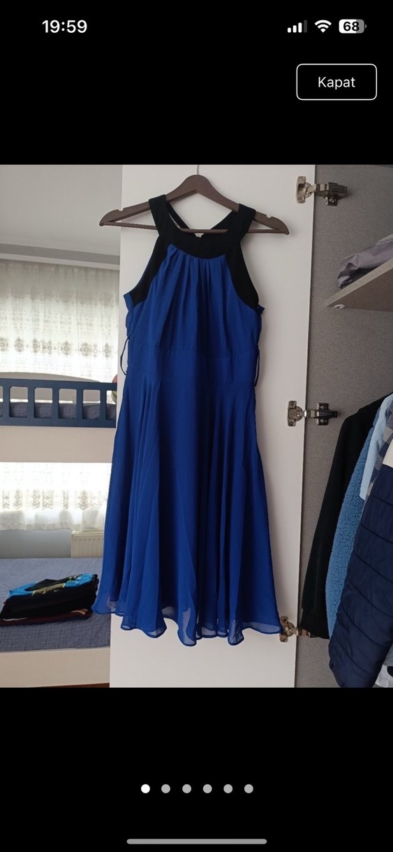 Drapeli, kolsuz, yüksek yakalı ve fitted kesime sahip midi uzunlukta koyu mavi abiye elbise. Modern klasik tarzıyla parti davetleri için uygundur.