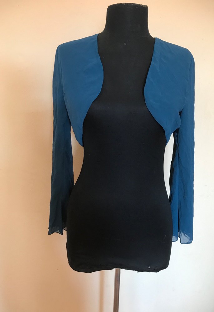 Koyu mavi renkte, straplez yakalı ve uzun kollu, vücuda oturan bolero. M beden Şifon kumaştan drapeli tasarıma sahip, gotik stile uygun.