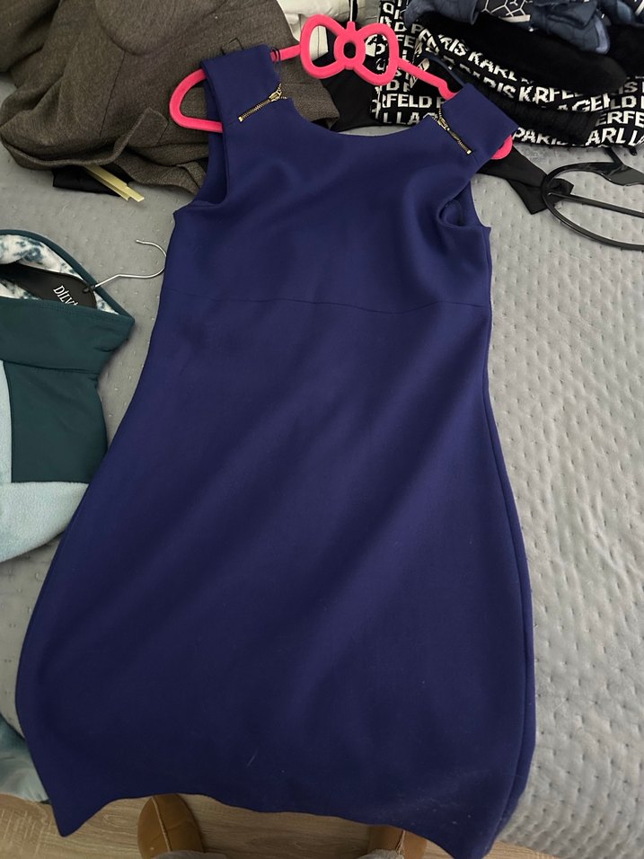 Koyu mavi renkte, drapeli ve V yakalı, fitted kesim, kolsuz midi elbise. Günlük kullanıma uygun şık bir model.