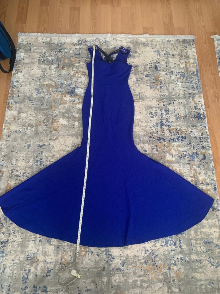 Koyu mavi, drapeli ve v yakalı, kolsuz uzun elbise. Şık ve klasik duruşuyla düğünler için uygundur. HİÇBİR kusuru yok. tarzım olmadığı ce giymediğim için satıyorum.