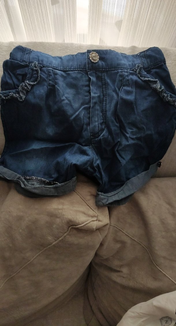 Düğmeli, bol kesim koyu mavi kot şort, sokak stiline uygun rahat ve sade tasarım. Katlanmış paça detayı bulunur.