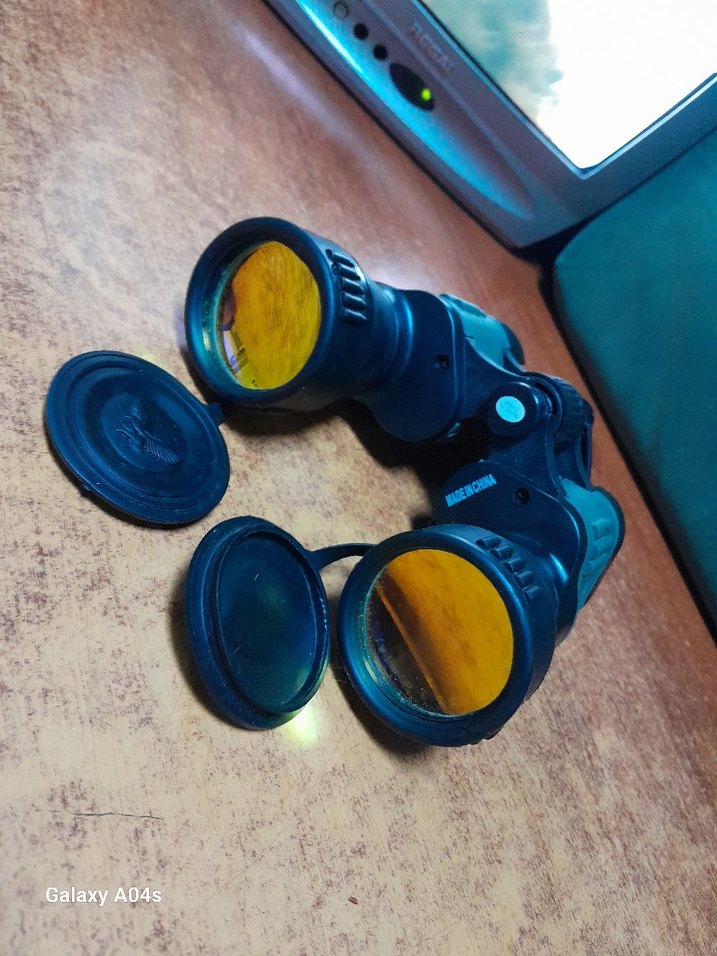 Dış mekan kullanımı için lens kapaklı, sarı tonlu camlara sahip koyu mavi dürbün.