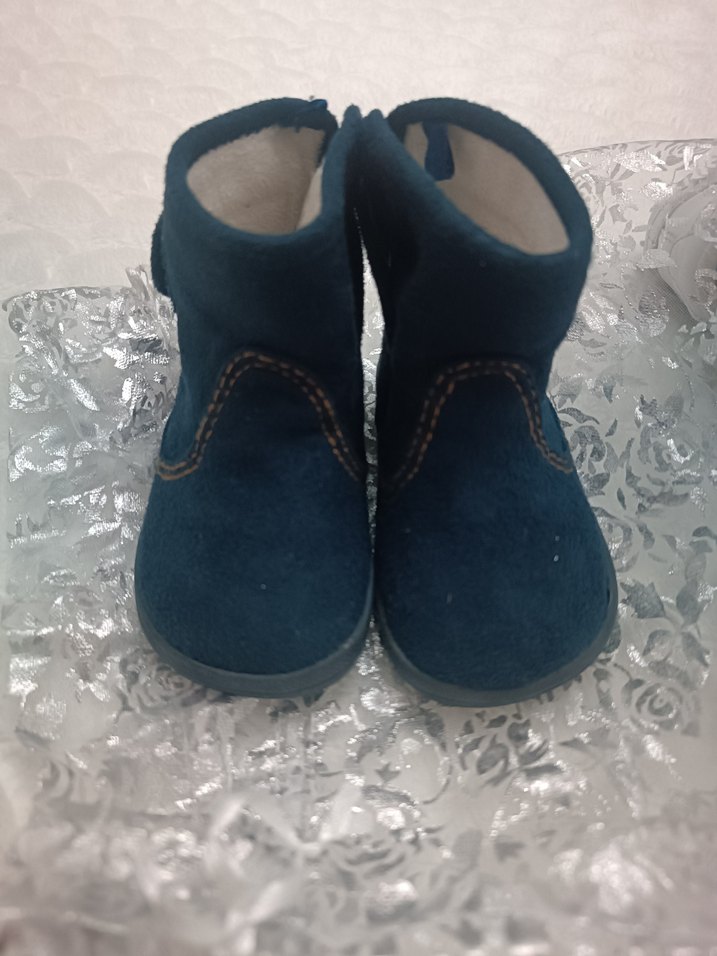 Koyu mavi renkte, işlemeli detaylara sahip, tokalı erkek bebek botları. Yumuşak ve sıcak kumaştan üretilmiştir, küçük ayaklar için rahat ve konforludur.