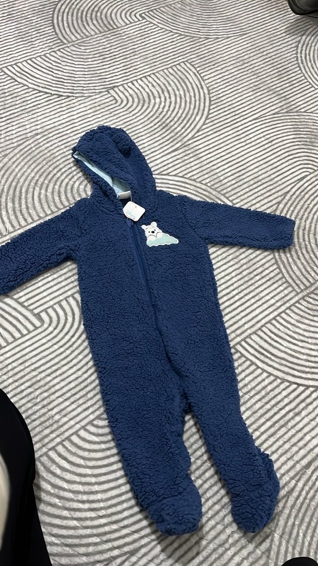 Koyu mavi örgü erkek bebek tulumu, yumuşak ve sıcak bir dokuyla, kapüşonlu ve kolay giyilmesi için tam fermuarlı.