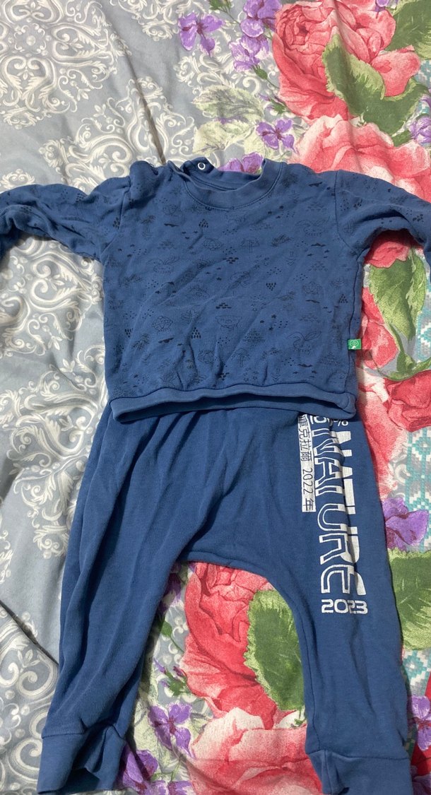 Koyu mavi renkli, uzun kollu ve bisiklet yaka örme erkek bebek takımı. Pantolonda "INATURE" baskısı bulunur.