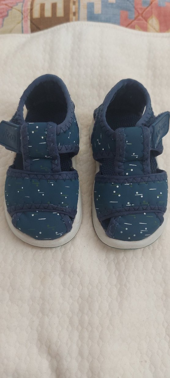 Koyu mavi renkte, cırt cırtlı bantlı, kauçuk malzemeden üretilmiş erkek çocuk terliği. Hiç bir sorunu yoktur.