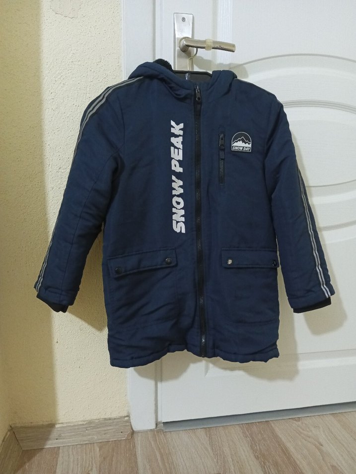 Koyu mavi renkli, fermuarlı ve cepli erkek çocuk montu. Notched lapel yakalı ve baskılı desene sahip, yumuşak ve sıcak kumaştan üretilmiştir. ❄️not sadece cebin bir tanesi hafiften aşınmış başka bir sorunu yoktur