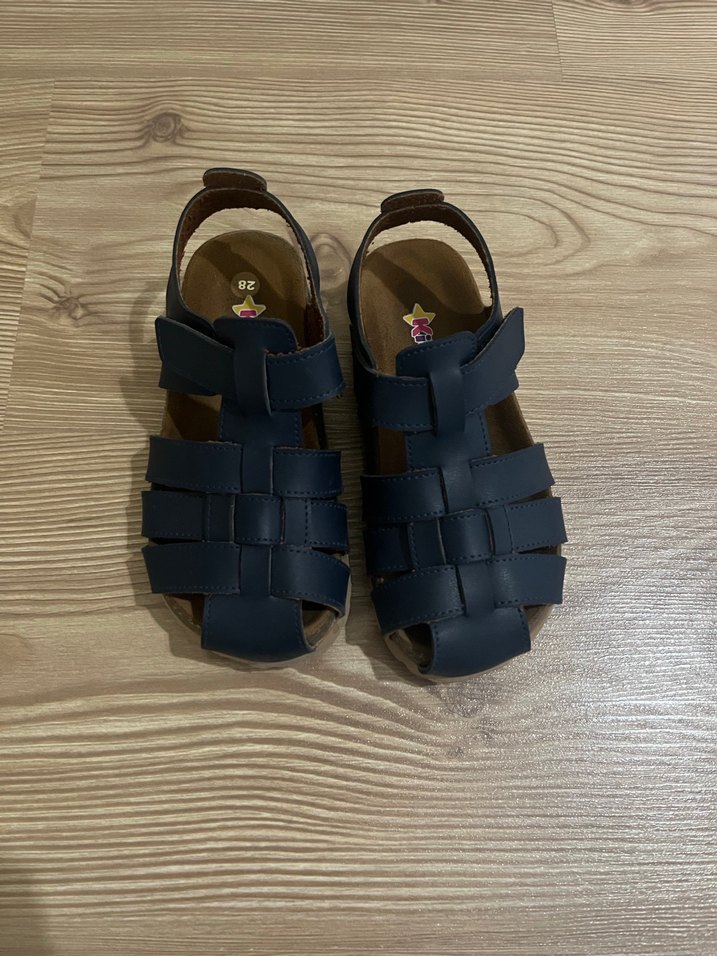 Koyu mavi renkte, kemerli kayışa sahip, kauçuk malzemeden yapılmış, kareli desenli, sade ve temel tarzda erkek çocuk sandaletleri. 28 numara