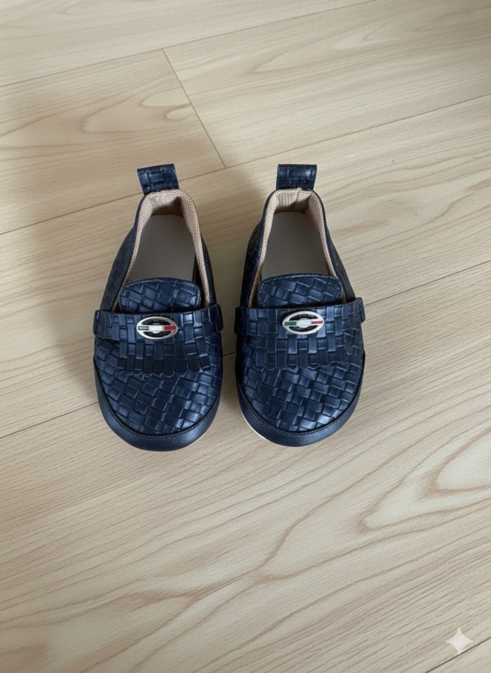 Koyu mavi renkli, tokalı ve dokuma desenli erkek çocuk loafer ayakkabılar, kauçuk malzemeden üretilmiştir.