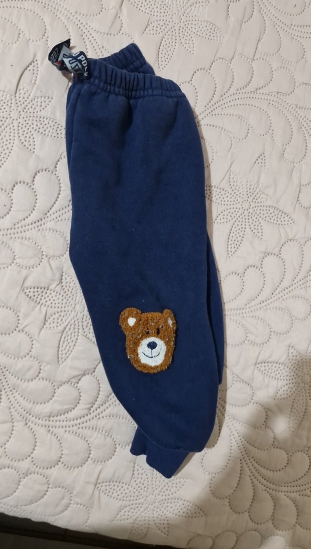Koyu mavi renkli, nakışlı ayıcık detaylı, yumuşak ve tüylü kumaştan erkek çocuk pantolonu, şık ve rahat bir sokak stili sunar.