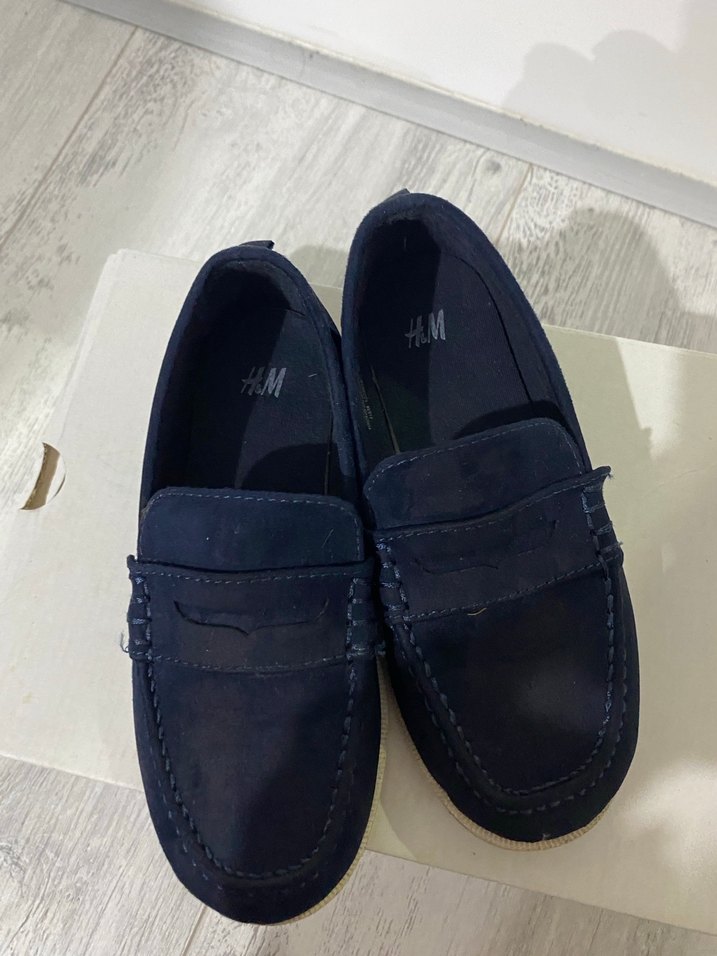 Koyu mavi renkte, süet dokulu, tokalı tasarıma sahip erkek çocuk ayakkabısı, trend sokak stiline uygun. HM marka 28 numara makosen