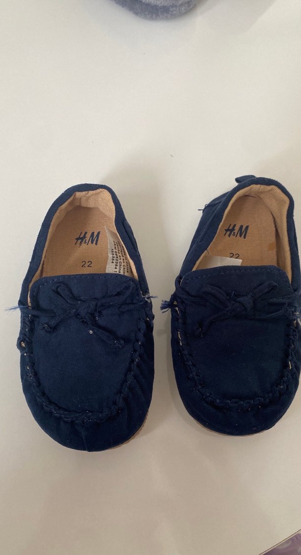 Koyu mavi renkte, tokalı ve düz desenli erkek çocuk loafer ayakkabılar, kauçuk tabanlıdır. H&M markası, 22 numara.