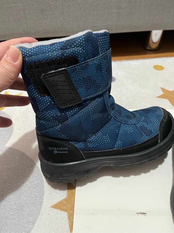 Koyu mavi yılan desenli erkek çocuk botu, kaymaz kauçuk taban ve cırt cırtlı kapanışa sahip.