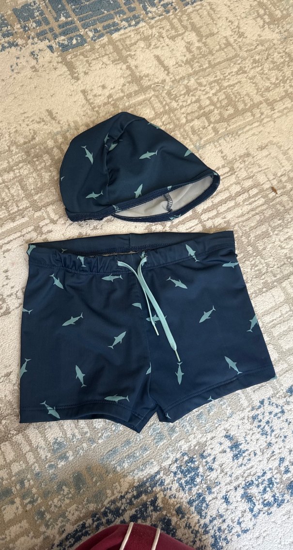 Koyu mavi, köpek balığı desenli erkek çocuk yüzme şortu ve uyumlu bone. Şortta ayarlanabilir bağcık bulunur.