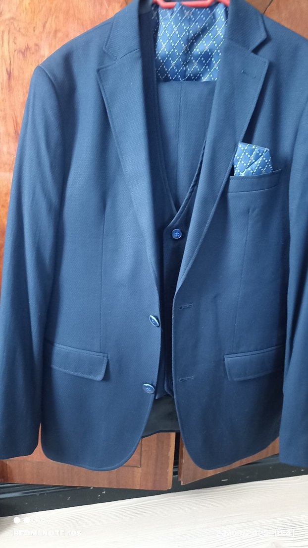 Düğmeli, klasik kesim, koyu mavi erkek takım elbise Modern klasik tarzda, ofis için uygun, yakalı ve desenli mendil detaylı. ️