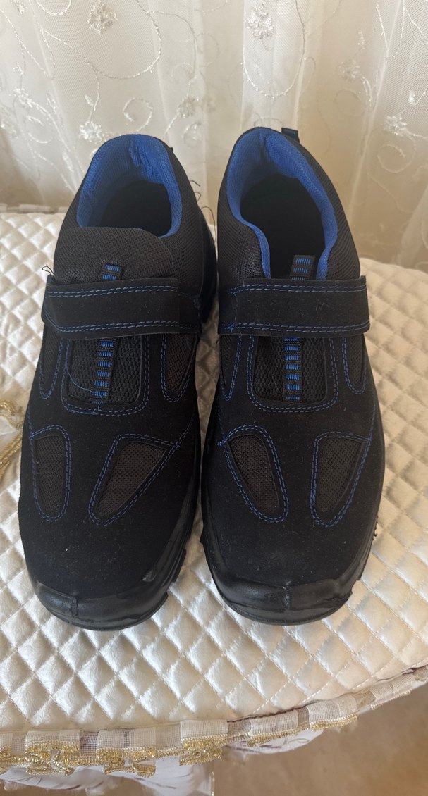 Koyu mavi renkli, velcro bantlı ve kauçuk tabanlı erkek iş spor ayakkabısı, rahat ve günlük kullanım için uygundur.